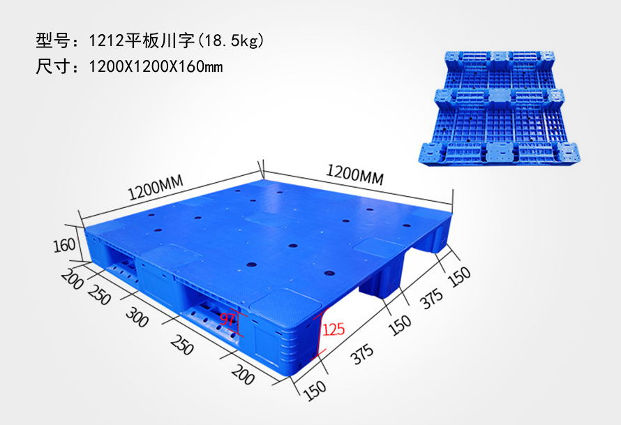 | 1212平板川字托盘 | 1200*1200*150/160 | 18.5 | 2T | 6T | 10 |
